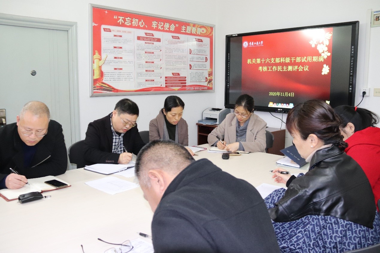 根据学校《关开展科级干部试用期满考核工作的通知》要求,机关十六支部成立了科级干部试用期考核小组,于11月4日上午对3名科级干部进行了考核,考核工作由支部书记刘强主持,资产管理处全体教职工参加。