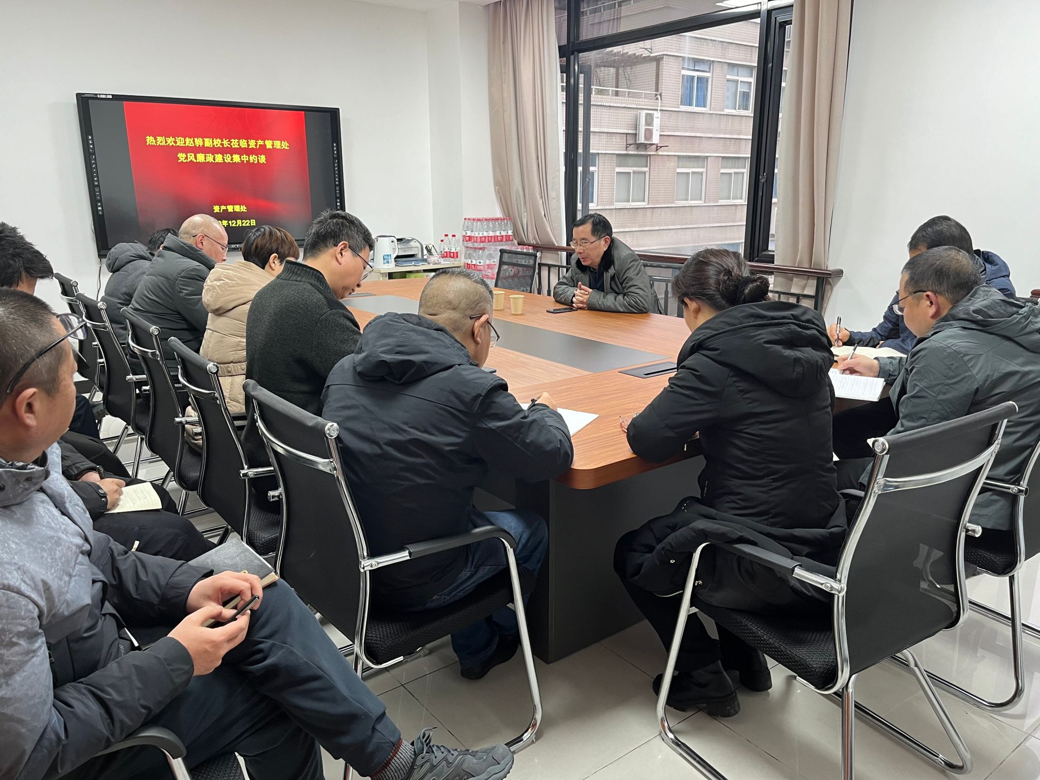 12月22日,党委常委、副校长赵骅主持召开资产管理处党风廉政建设集体约谈会,对处级、科级干部以及全体教师进行集体约谈。