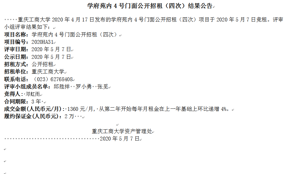 学府苑内4号门面公开招租(四次)结果公告