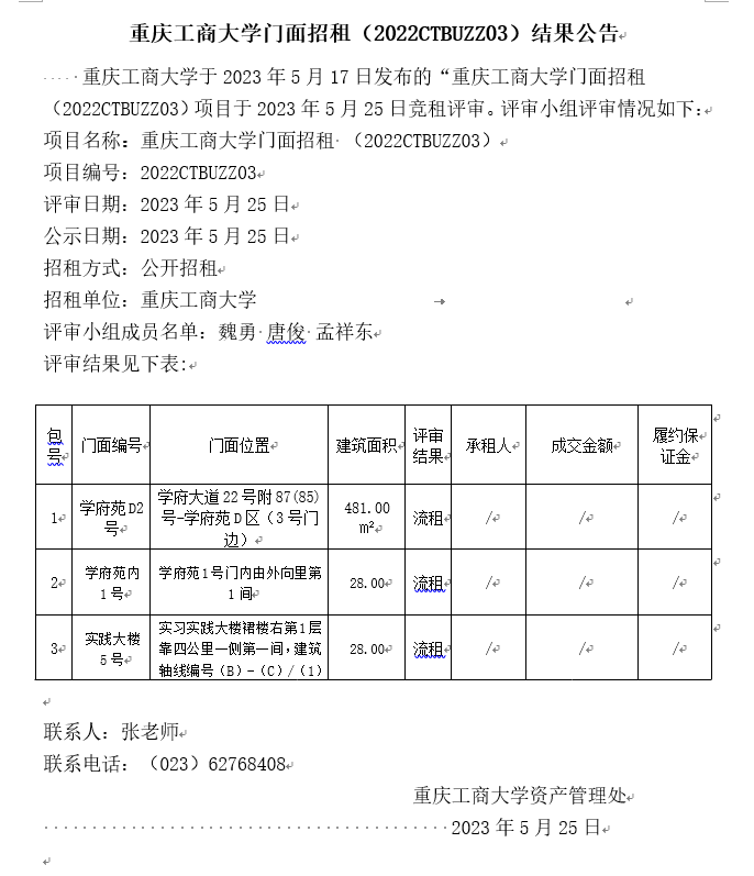 2138CC太阳集团门面招租(2023CTBUZZ04)结果公告