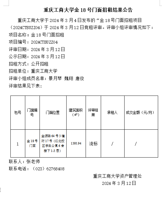 2138CC太阳集团金18号门面招租结果公告