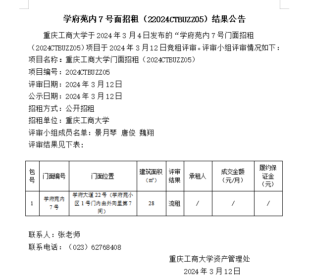 学府苑内7号面招租(22024CTBUZZ05)结果公告