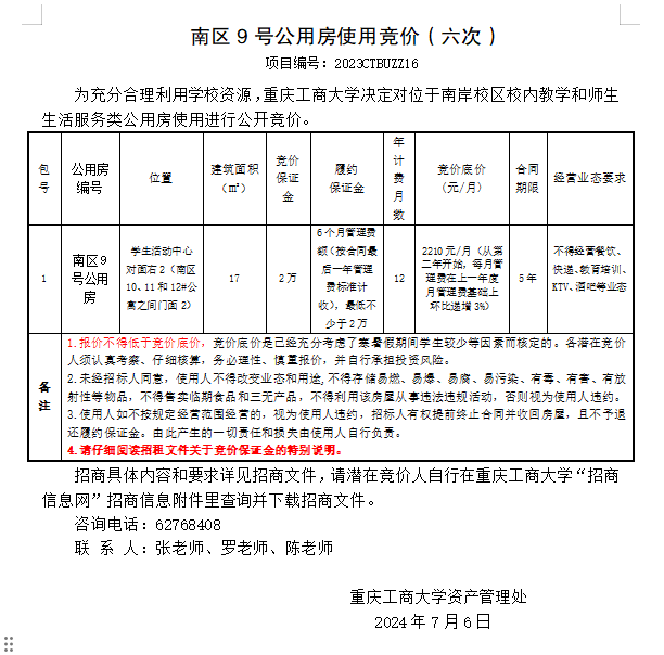 南区9号公用房使用竞价六次结果公告