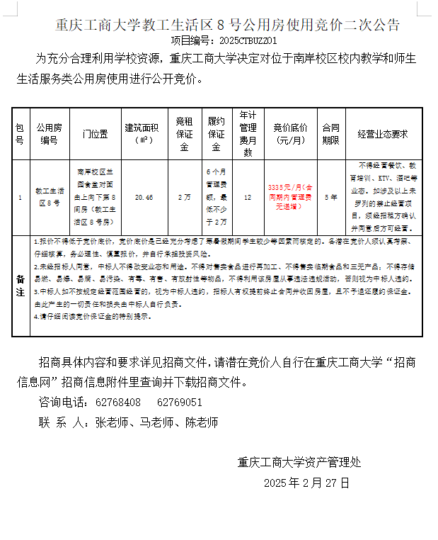 2138CC太阳集团教工生活区8号公用房使用竞价二次公告