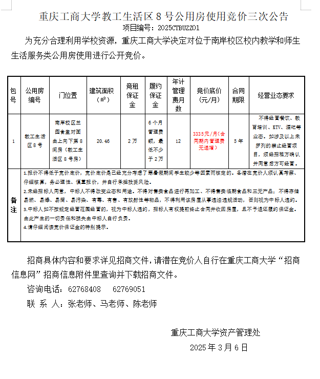 2138CC太阳集团教工生活区8号公用房使用竞价三次公告
