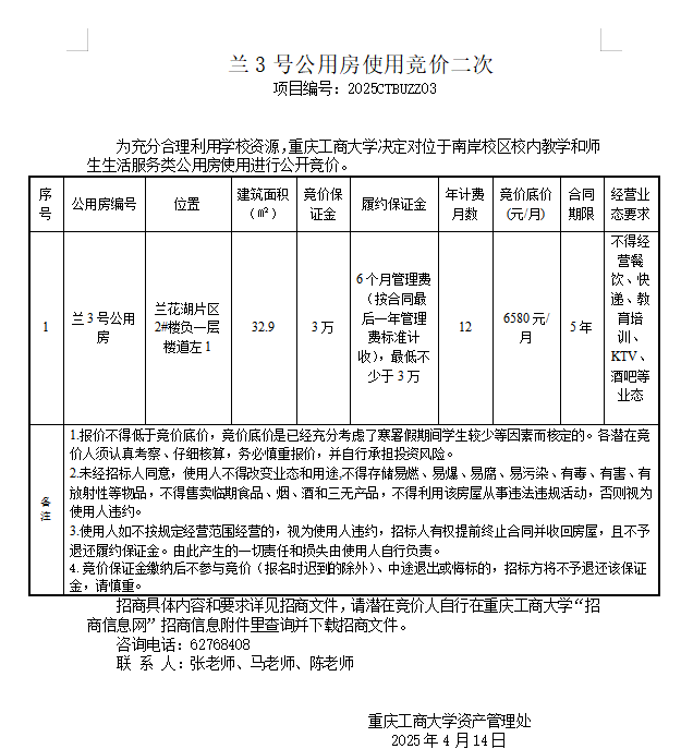 兰3号公用房使用竞价结果公告