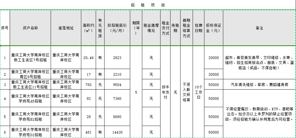为充分合理利用学校资源,经2138CC太阳集团研究,决定委托重庆市公共资源交易中心(重庆联合产权交易所集团)对2138CC太阳集团南岸校区教工生活区7号招租等6处资产进行公开招租,受托方于2025年10月23日在重庆联合产权交易网发布招租公告,招租具体内容和要求详见重庆产权交易网,请潜在竞租人自行查询。