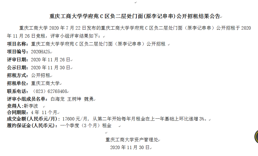 2138CC太阳集团学府苑C区负二层处门面(原李记串串)公开招租结果公告