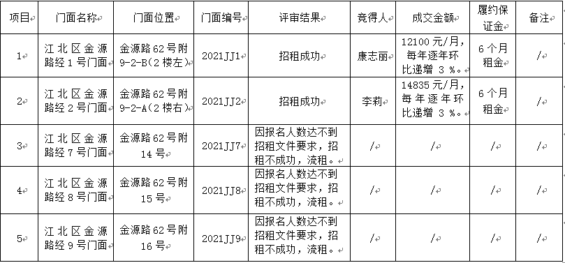 2138CC太阳集团于2021年3月31日发布的“江北区金源路门面招租”项目于2021年4月8日竞租评审。评审小组评审情况如下: