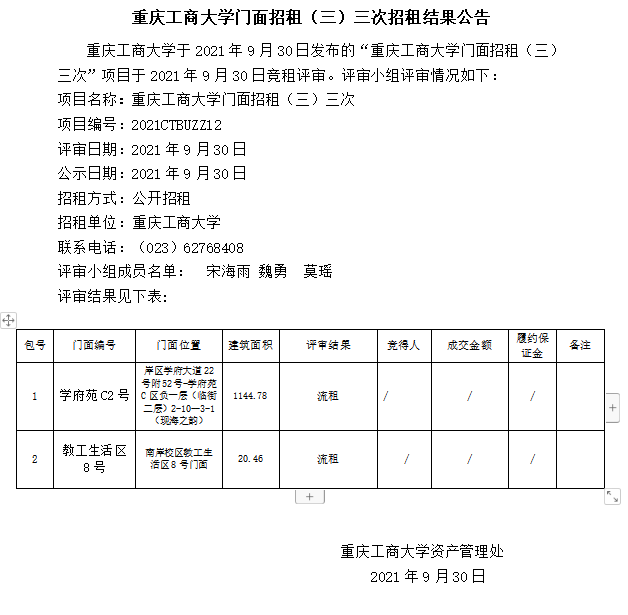 2138CC太阳集团门面招租(三)四次招租结果公告
