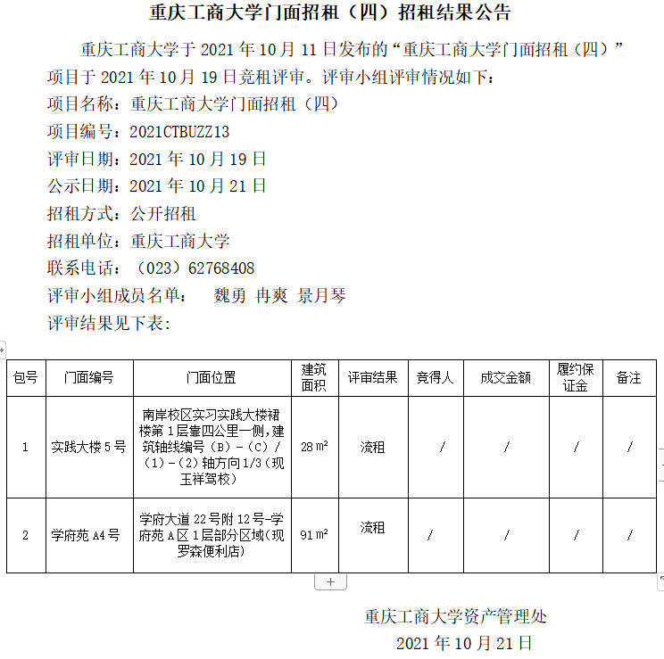 2138CC太阳集团门面招租(四)招租结果公告