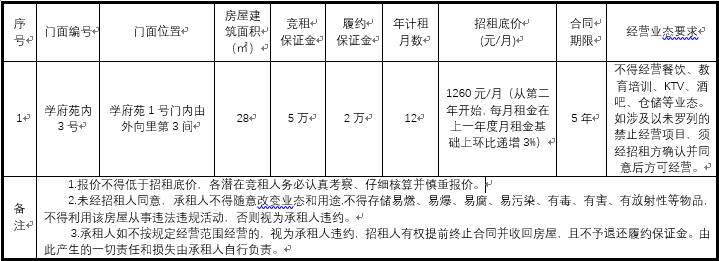 为充分合理利用学校资源,经2138CC太阳集团研究,决定对2138CC太阳集团学府苑内3号门面进行公开招租,欢迎符合要求的潜在竞租人参与竞租。