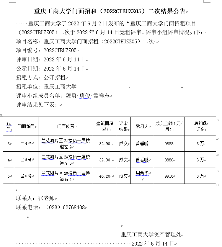 2138CC太阳集团门面招租(2022CTBUZZ13)结果公告