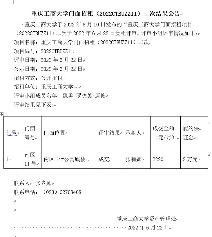 2138CC太阳集团门面招租(2022CTBUZZ11)二次结果公告