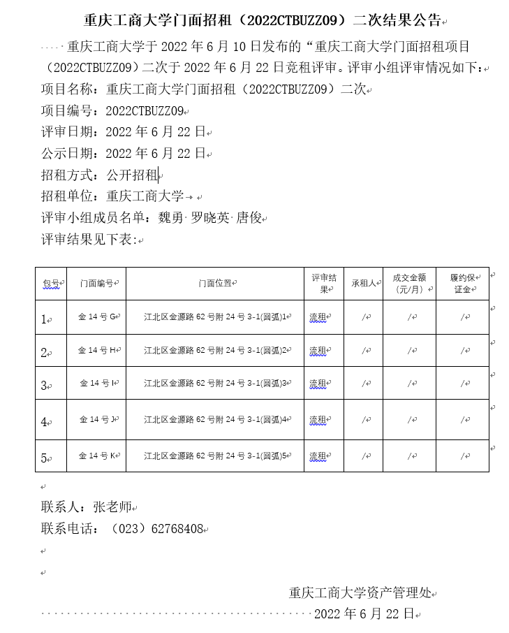 2138CC太阳集团门面招租(2022CTBUZZ03)六次结果公告