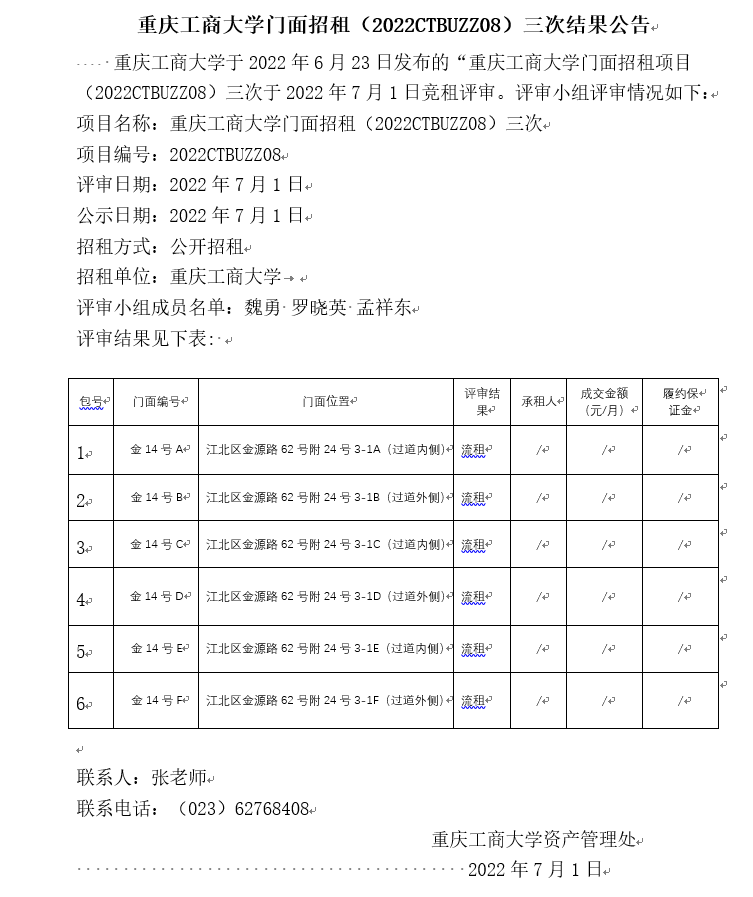 2138CC太阳集团门面招租(2022CTBUZZ03)七次结果公告