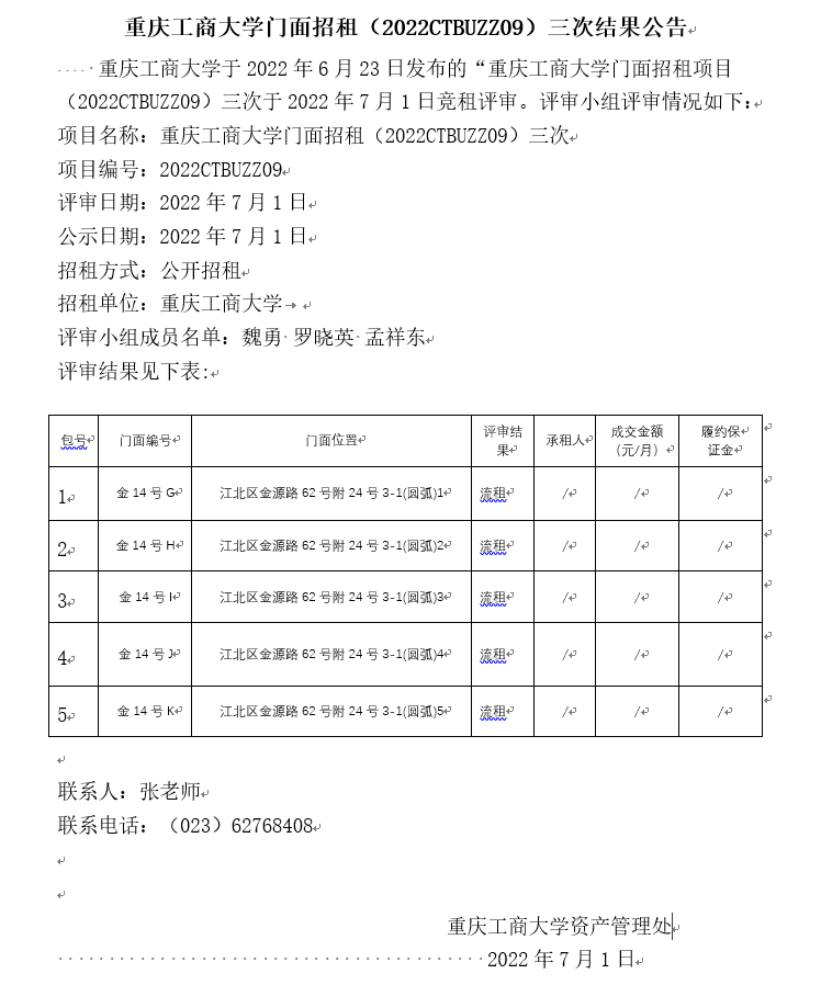 2138CC太阳集团门面招租(2022CTBUZZ08)三次结果公告