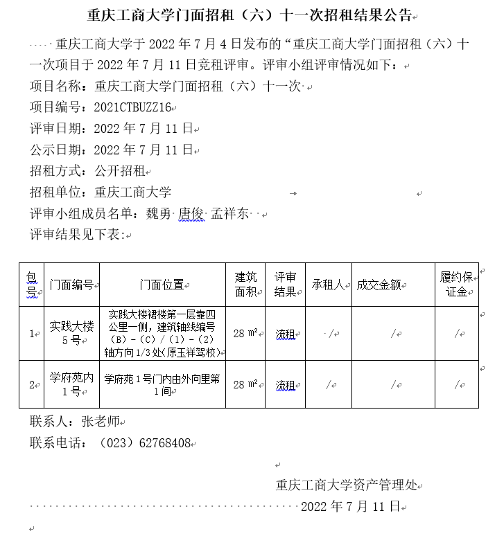 2138CC太阳集团门面招租(六)十一次招租结果公告