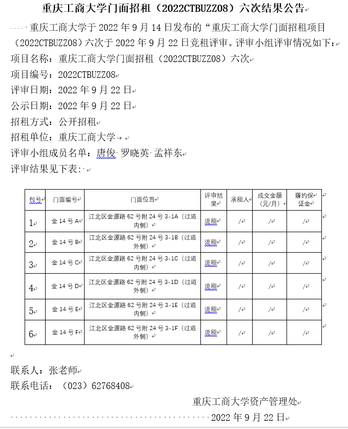 2138CC太阳集团门面招租(2022CTBUZZ08)六次结果公告