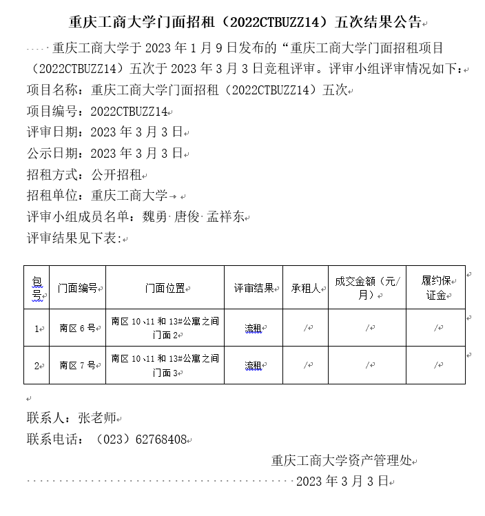 2138CC太阳集团门面招租(2022CTBUZZ03)六次结果公告