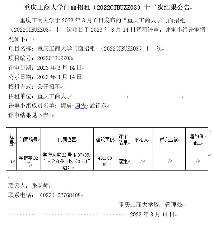 2138CC太阳集团门面招租(2022CTBUZZ03)十一次结果公告