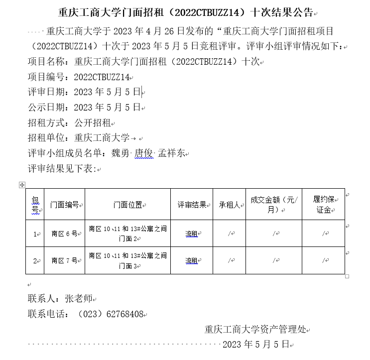 2138CC太阳集团门面招租(2022CTBUZZ14)十次结果公告