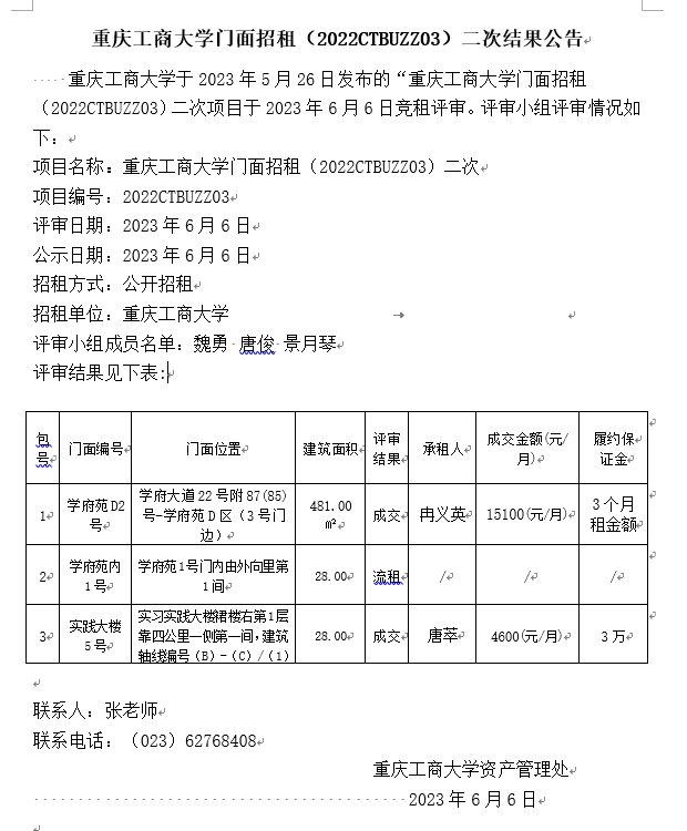2138CC太阳集团门面招租(2023CTBUZZ05)二次结果公告