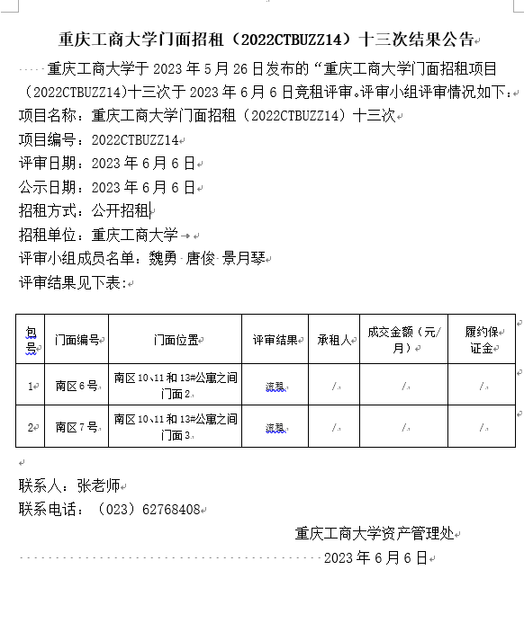 2138CC太阳集团门面招租(2022CTBUZZ14)十三次结果公告