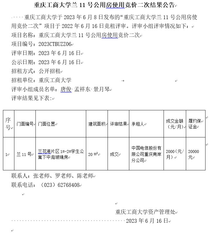 2138CC太阳集团兰11号公用房使用竞价二次结果公告