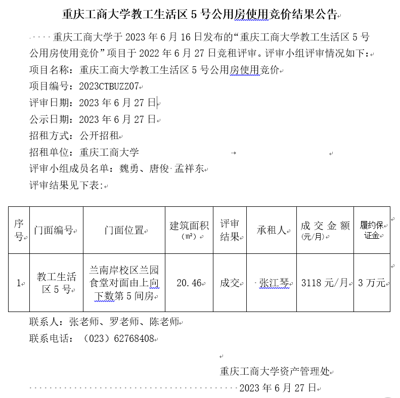 2138CC太阳集团教工生活区5号公用房使用竞价结果公告