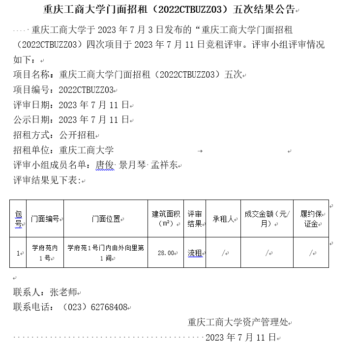 2138CC太阳集团门面招租(2022CTBUZZ03)五次结果公告