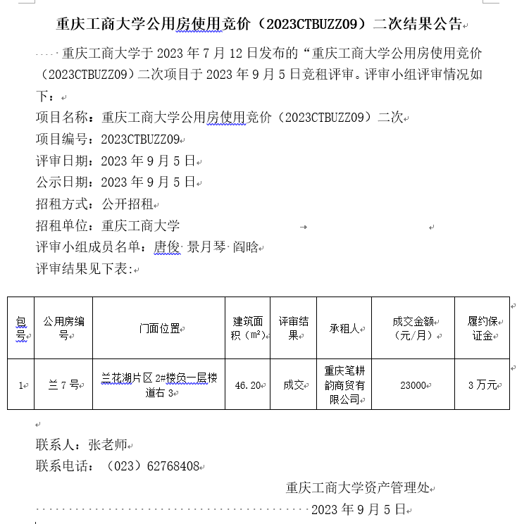 2138CC太阳集团公用房使用竞价(2023CTBUZZ09)二次结果公告
