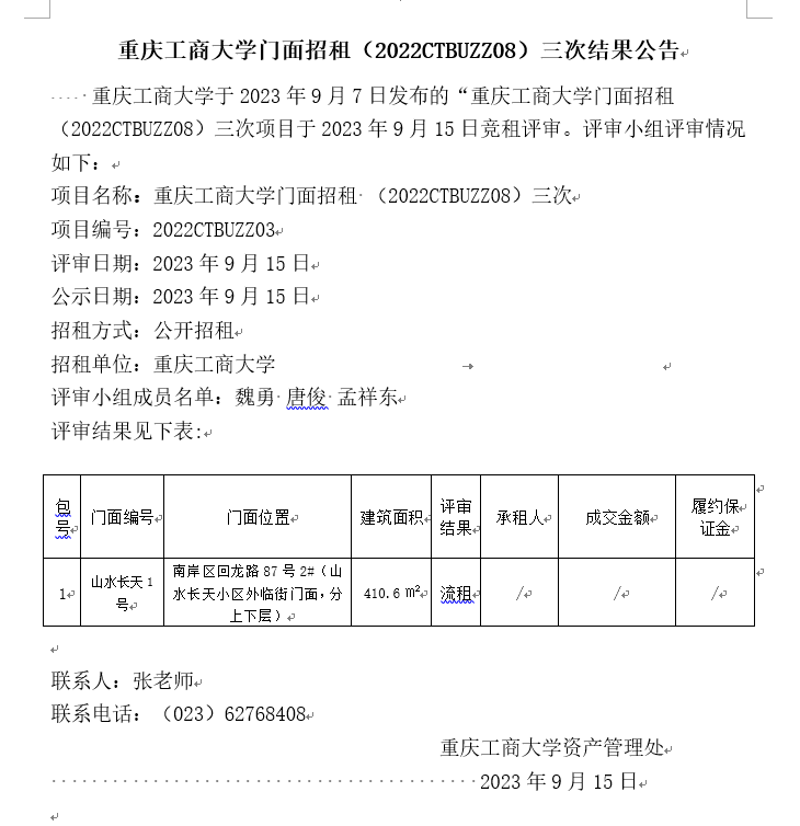 2138CC太阳集团门面招租(2022CTBUZZ08)三次结果公告
