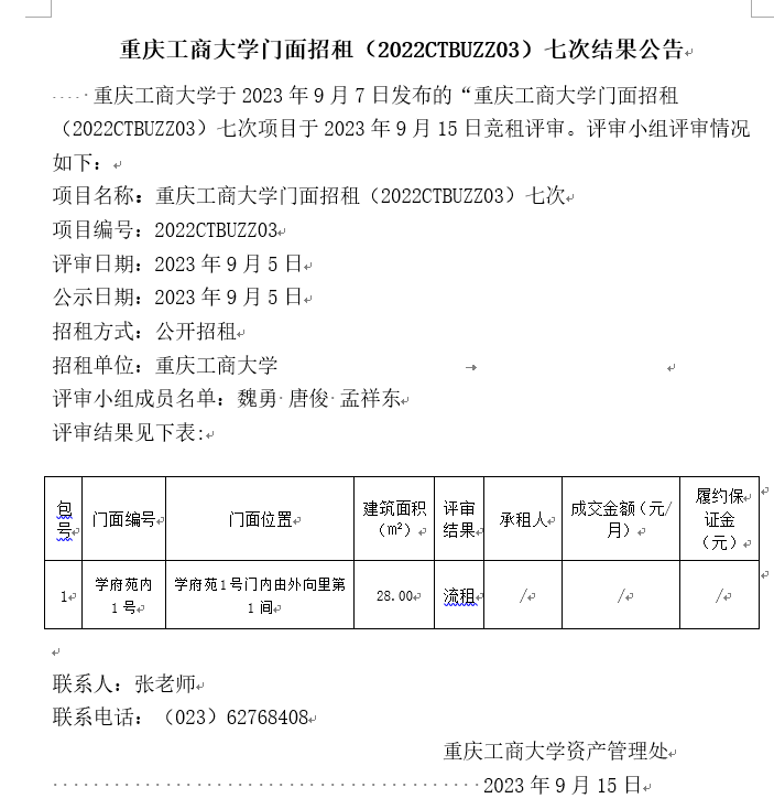 2138CC太阳集团门面招租(2022CTBUZZ03)八次结果公告