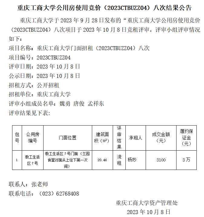 2138CC太阳集团公用房使用竞价(2023CTBUZZ04)八次结果公告