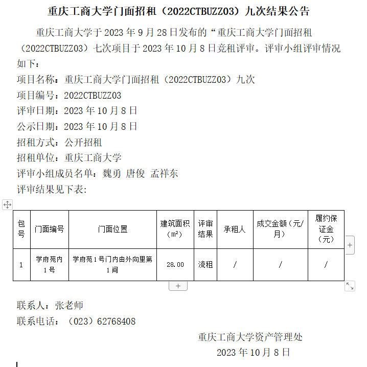 2138CC太阳集团门面招租(2022CTBUZZ03)八次结果公告