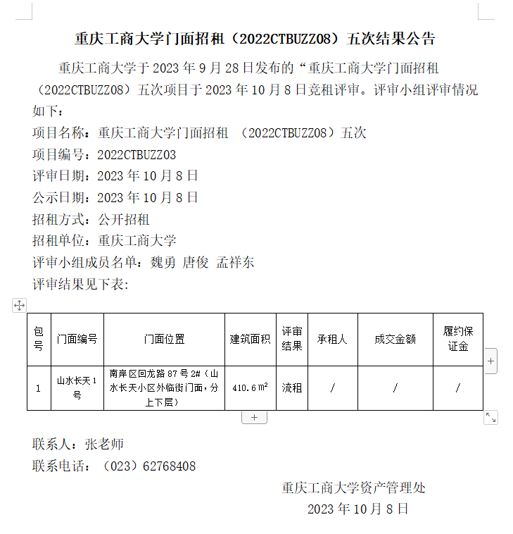 2138CC太阳集团门面招租(2022CTBUZZ08)六次结果公告