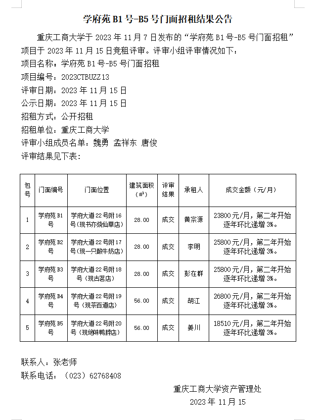 学府苑B1号-B5号门面招租结果公告