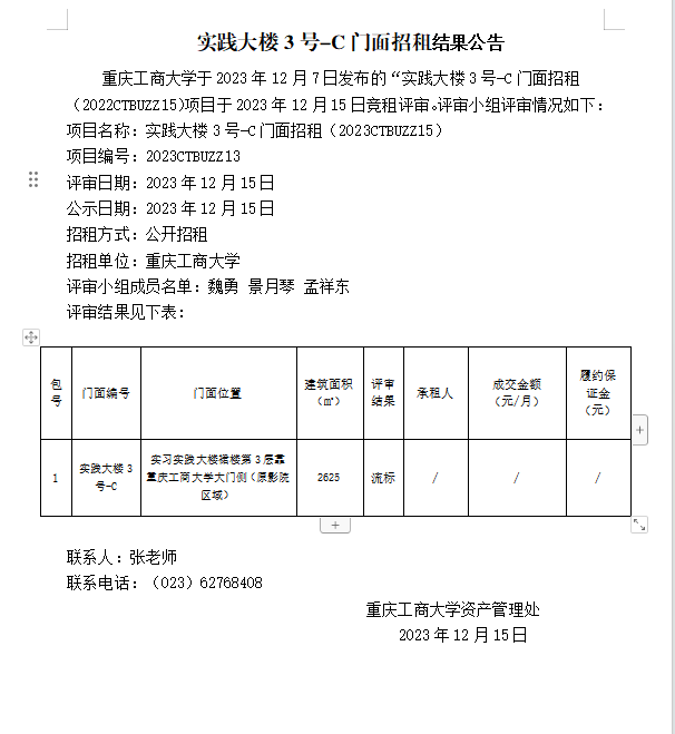 实践大楼3号-C门面招租结果公告