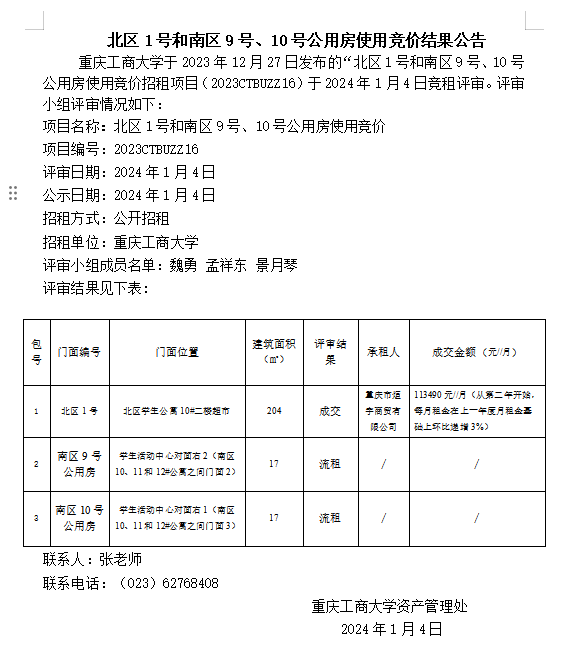 北区1号和南区9号、10号公用房使用竞价结果公告