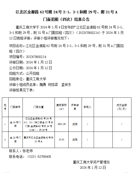 江北区金源路62号附24号2-1、3-1和附29号、附31号A 门面招租(四次)结果公告