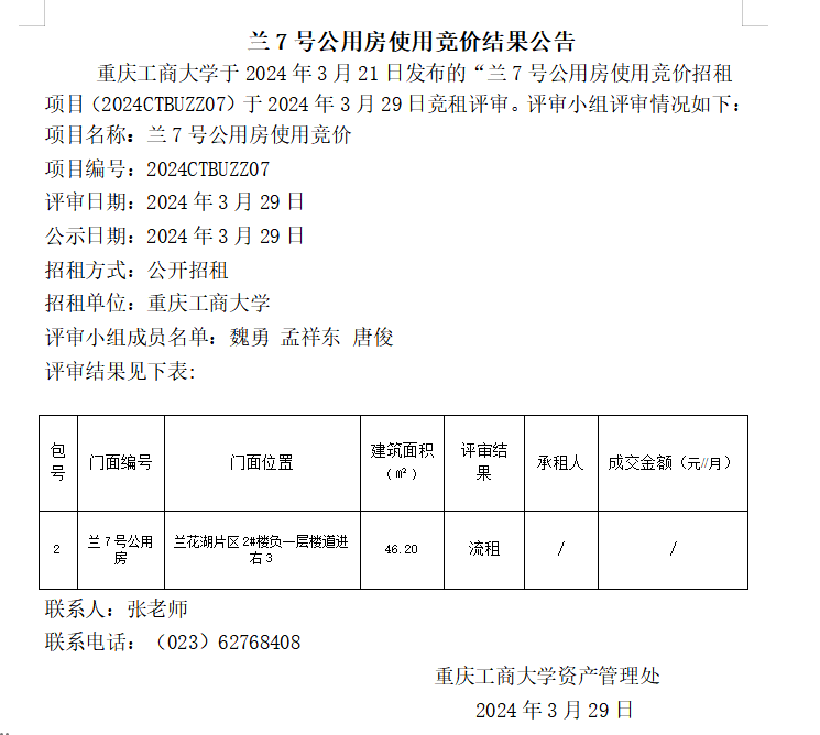 兰7号公用房使用竞价结果公告