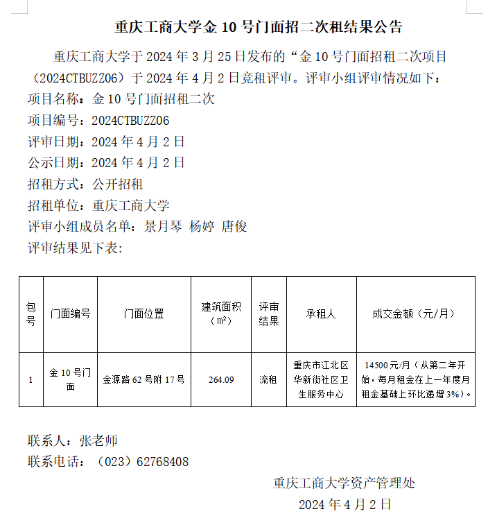 学府苑内7号面招租三次(22024CTBUZZ05)结果公告