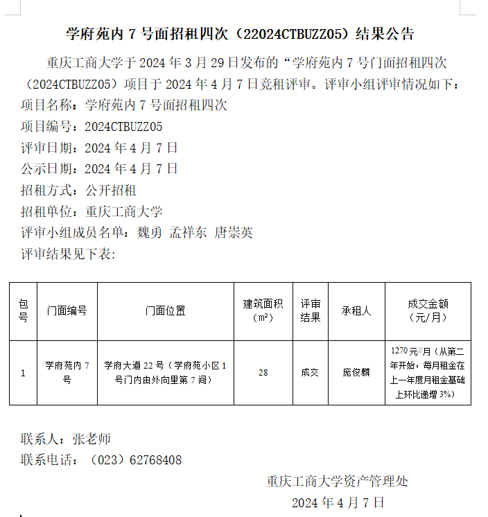 学府苑内7号面招租四次(22024CTBUZZ05)结果公告