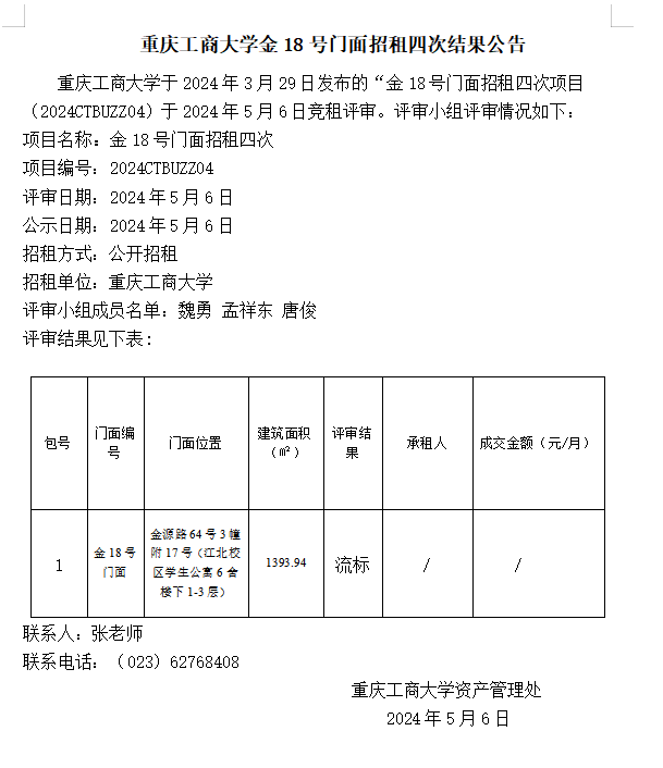 2138CC太阳集团门面招租(2023CTBUZZ08)十次结果公告