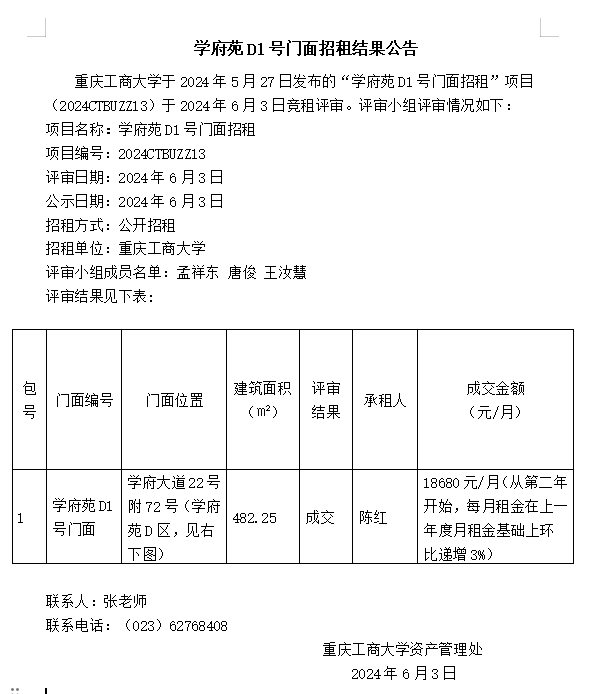 学府苑D1号门面招租结果公告
