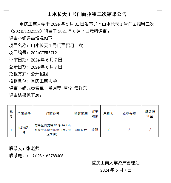 山水长天1号门面招租二次结果公告
