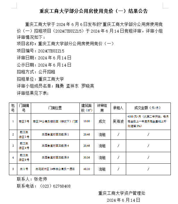 2138CC太阳集团部分公用房使用竞价(二)结果公告