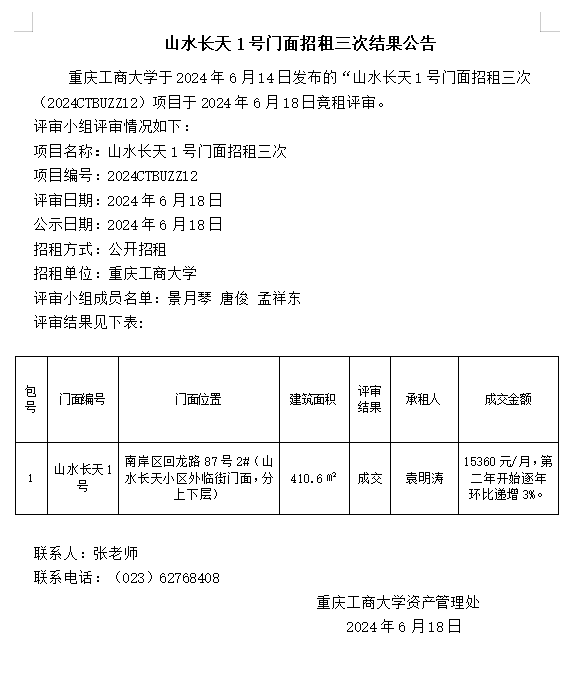 山水长天1号门面招租三次结果公告
