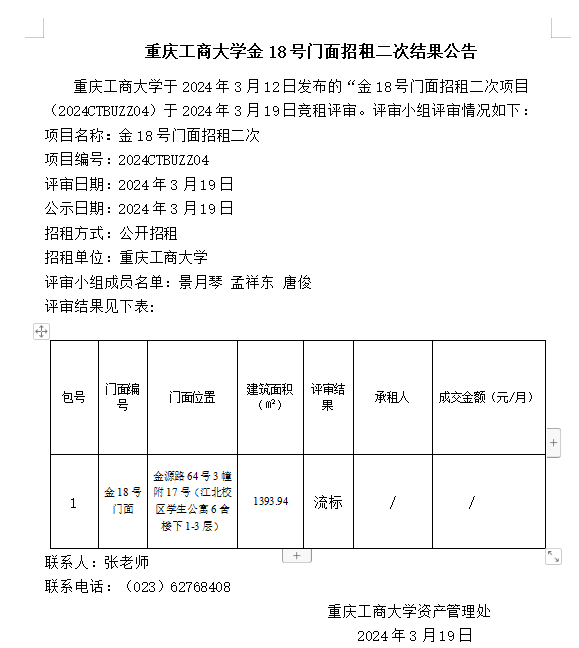 2138CC太阳集团金18号门面招租二次结果公告